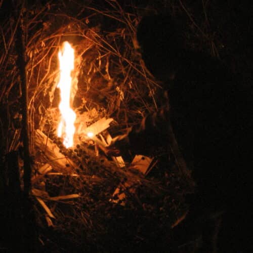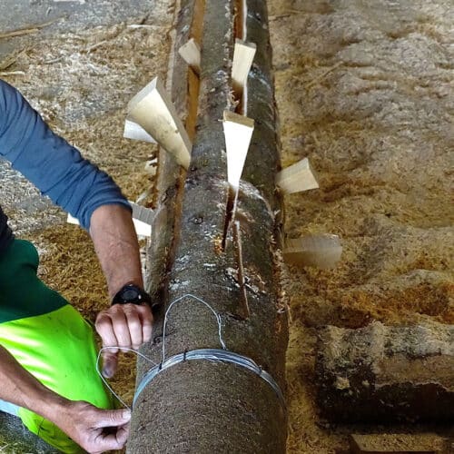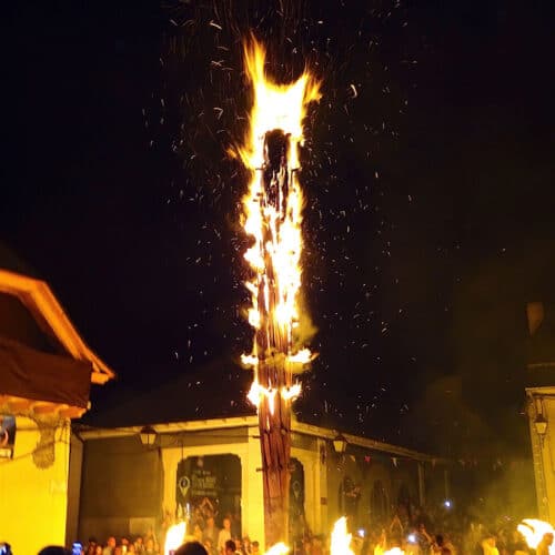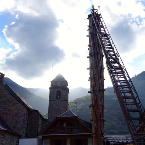 En Pyrénées centrales, un arbre est coupé et son fût est fendu en longueur, avant d’y enfoncer plusieurs centaines de coins en bois. Ce tronc, que l’on appelle “le brandon” ou “eth har/eth halhar”, peut être écorcé ou habillé de paille, parfois couronné d’un bouquet de fleurs au sommet. Mis à feu par une personnalité reconnue (ou un prénommé “Jean”), il va se consumer lentement, les flammes s’échappant par la cheminée formée par le tronc fendu.