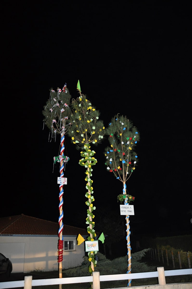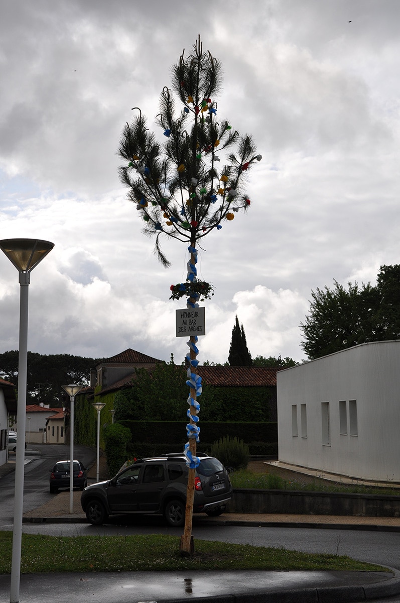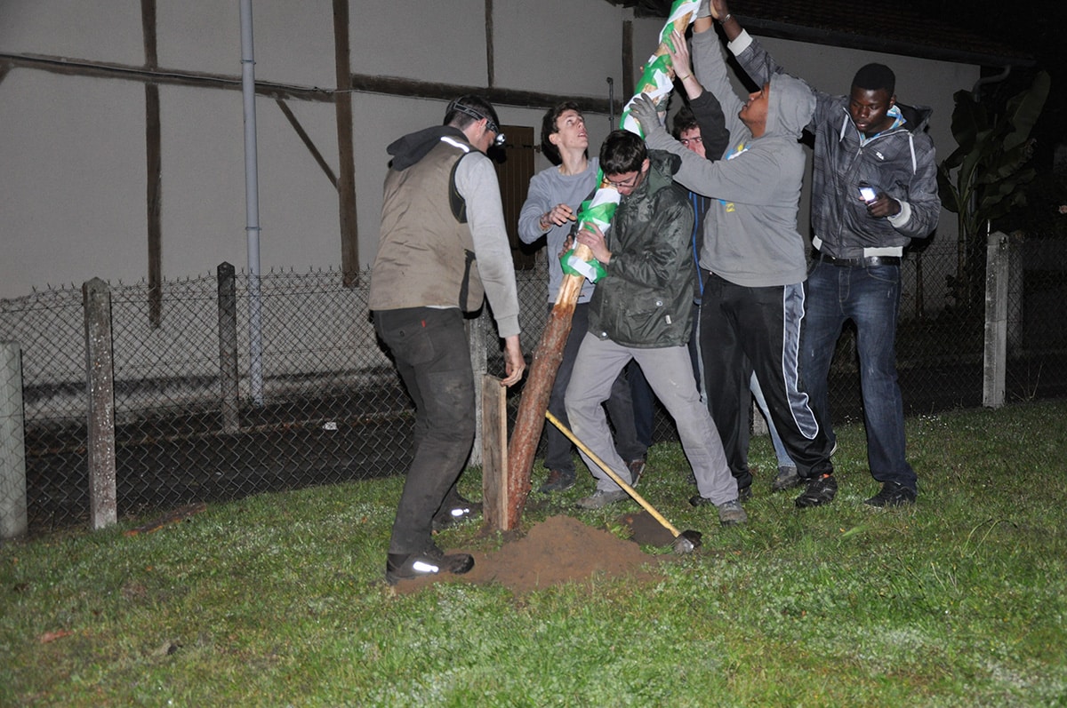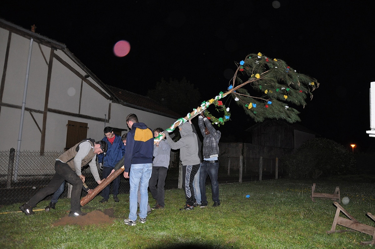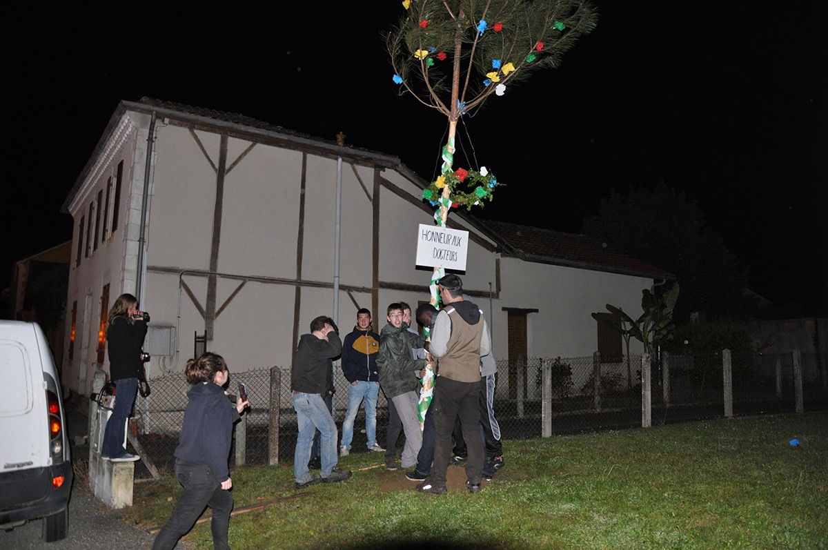 Photos de la pose des mais d’honneur dans ce village par “la classe”, dans la nuit du 30 avril au 1 mai 2014. Photos de Rémy Berdou, enquête : Mathilde Lamothe, Patricia Heiniger-Castéret et Rémy Berdou (Laboratoire ITEM EA 3002, Université de Pau et des Pays de l’Adour).