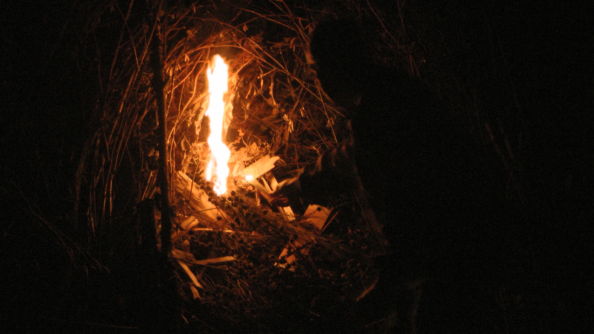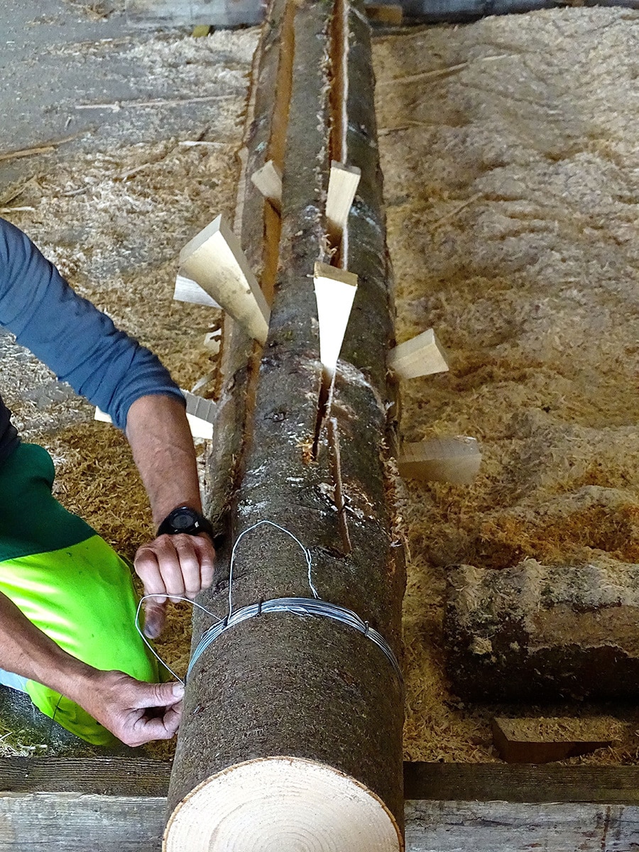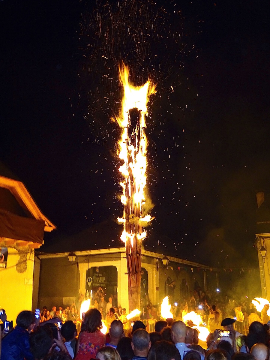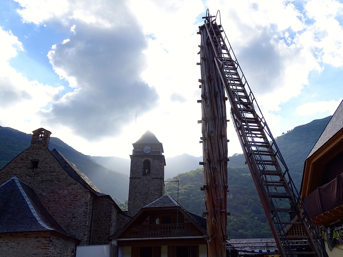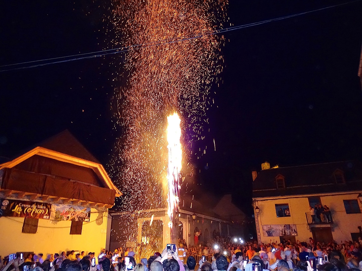En Pyrénées centrales, un arbre est coupé et son fût est fendu en longueur, avant d’y enfoncer plusieurs centaines de coins en bois. Ce tronc, que l’on appelle “le brandon” ou “eth har/eth halhar”, peut être écorcé ou habillé de paille, parfois couronné d’un bouquet de fleurs au sommet. Mis à feu par une personnalité reconnue (ou un prénommé “Jean”), il va se consumer lentement, les flammes s’échappant par la cheminée formée par le tronc fendu.