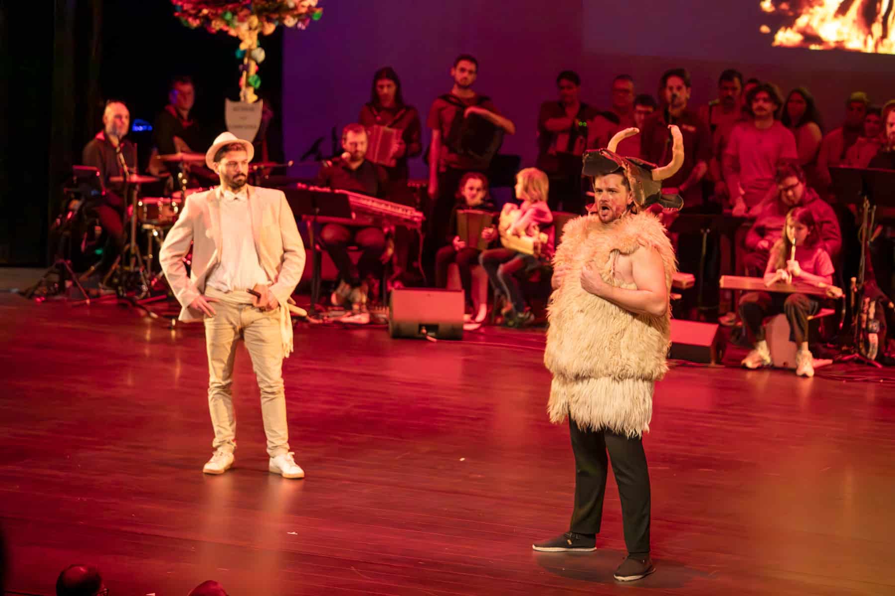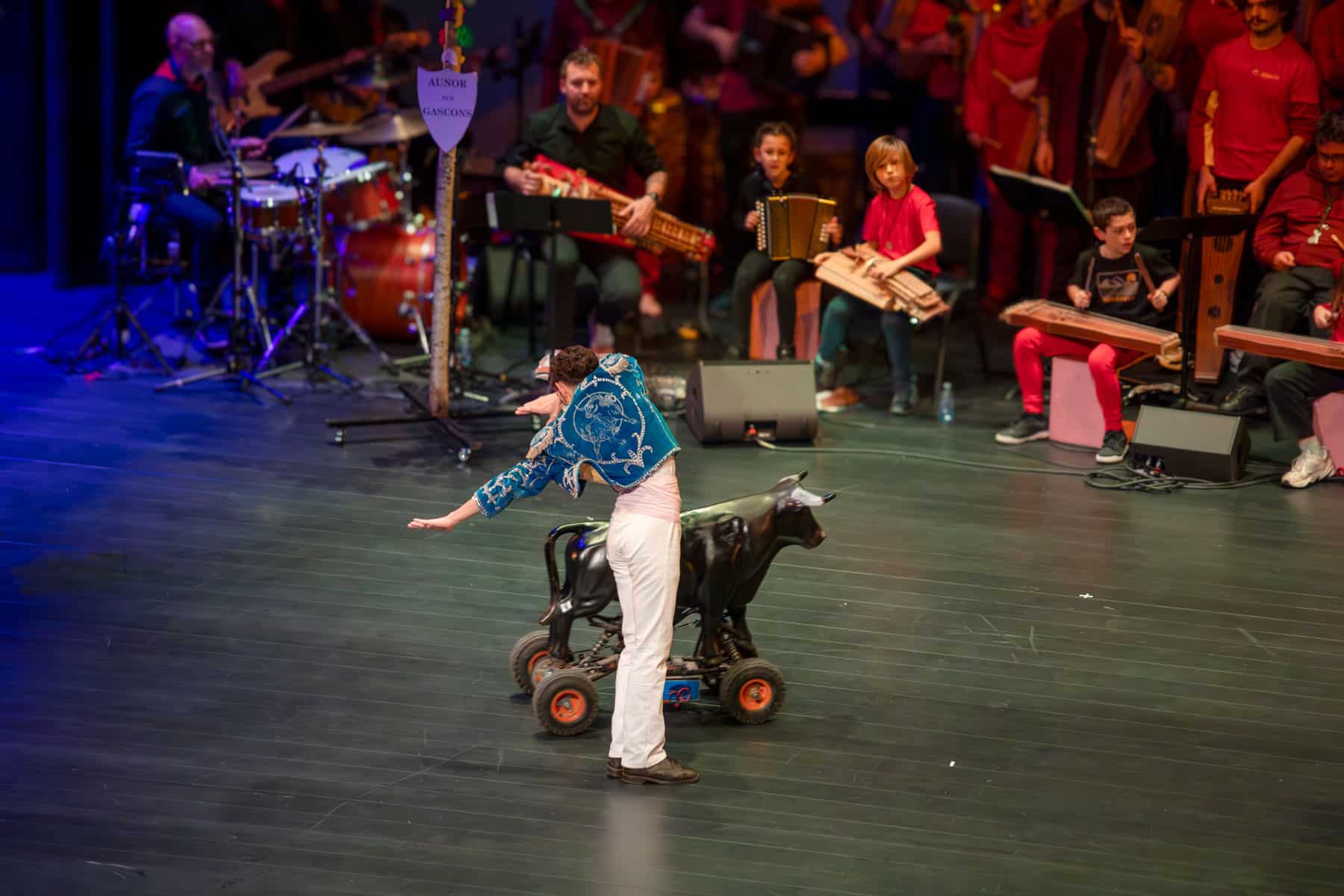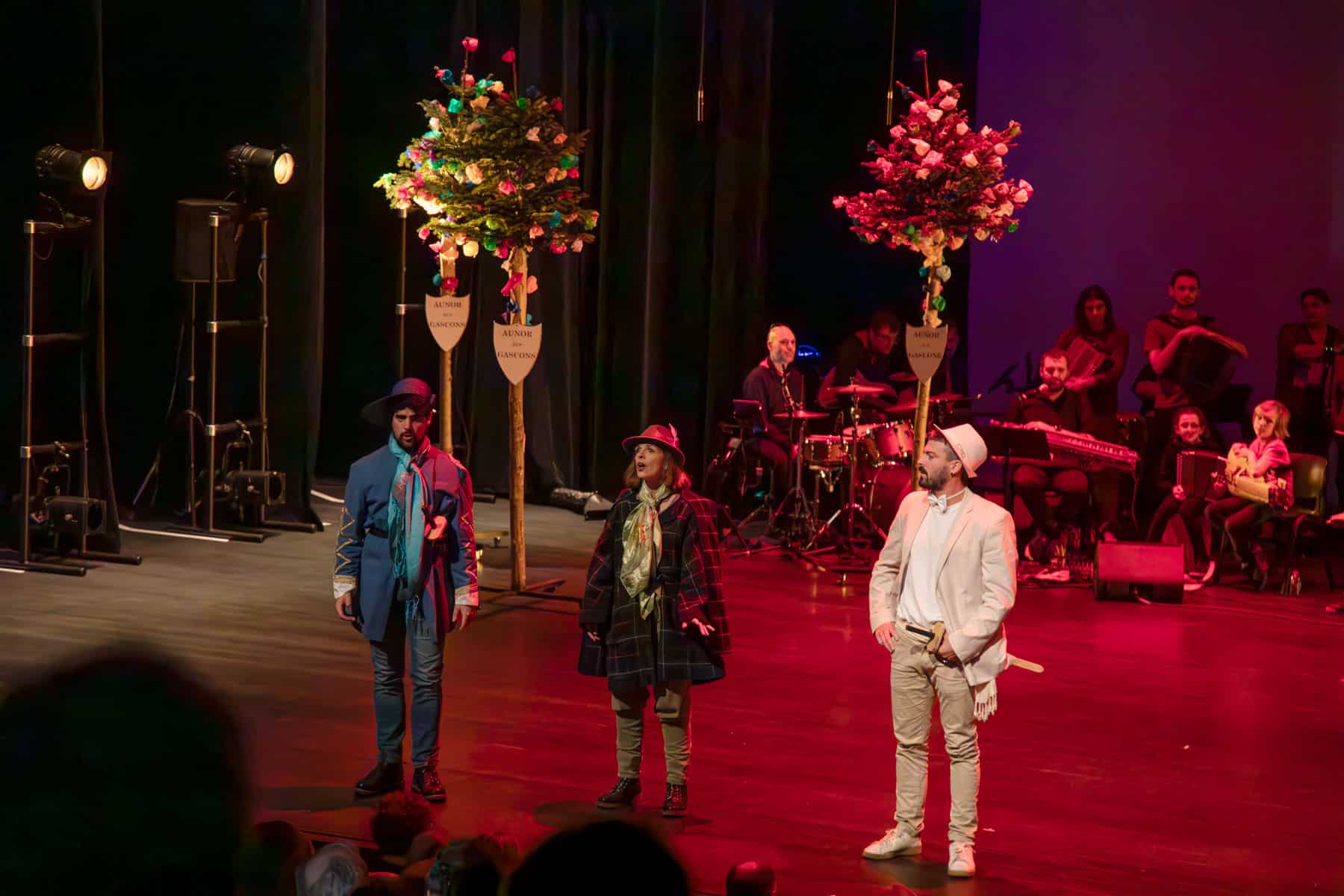 150 coristas, dançaires, actors, « de halha en halha », que’s mobilizan tà afrontar las armadas deu rei Eròdes, dont lo terrific Ramponòt de la mitologie gascona, e auvar atau « la Hèsta gascona de Nadau ».