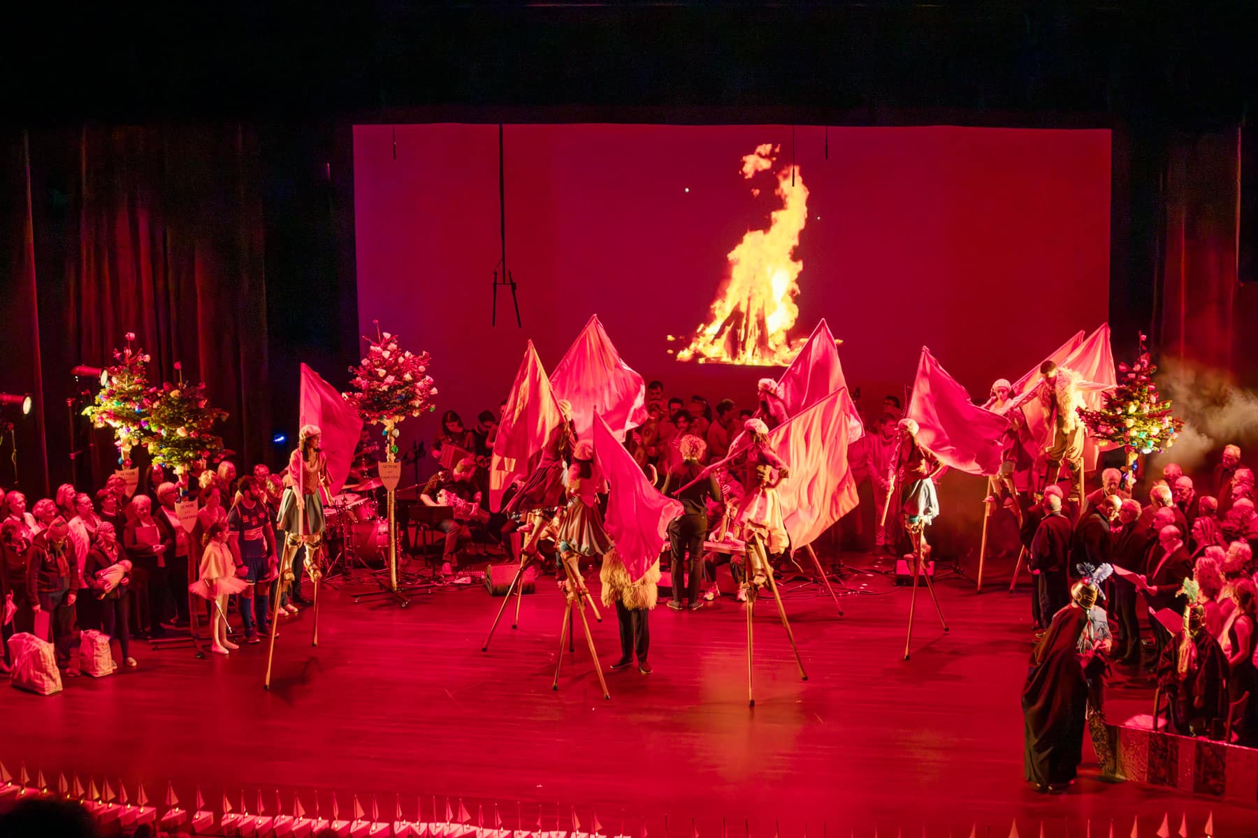 150 choristes, danseurs, acteurs, «de halha en halha » de flamme en flamme, se mobilisent pour affronter les armées du roi Hérode, dont le terrifiant Ramponeau de la mythologie gasconne, et sauver ainsi la « Fête gasconne de Noël ».