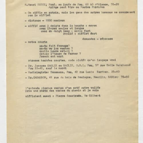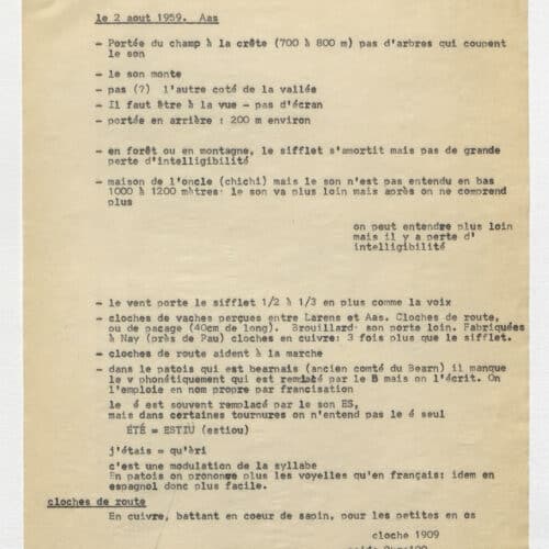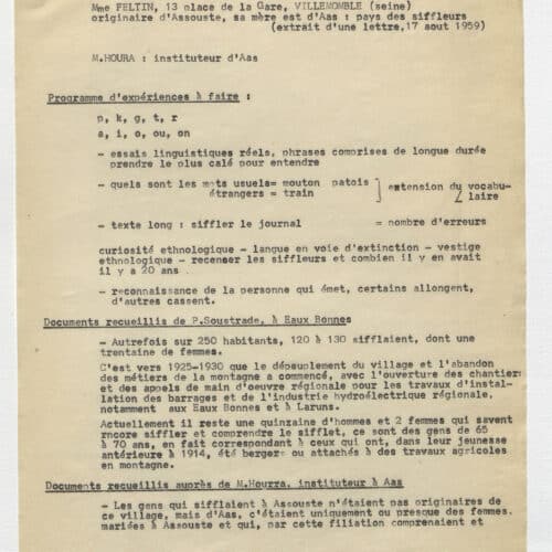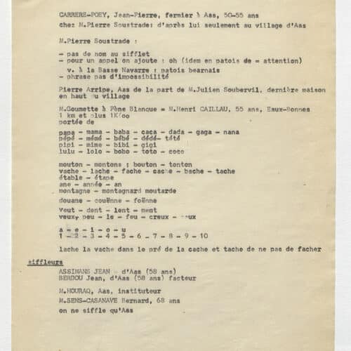 En 1959, on découvrait que les habitants du village d’Aas, en vallée d’Ossau, communiquaient à grande distance grâce à des modulations sifflées. Immédiatement, René-Guy Busnel, chercheur spécialisé en acoustique, étudia ce qu’on appellerait désormais le “langage sifflé d’Aas”. A peine 40 ans plus tard, ce mode de communication original disparut avec la mort de Netou Palas, la dernière siffleuse ossaloise.