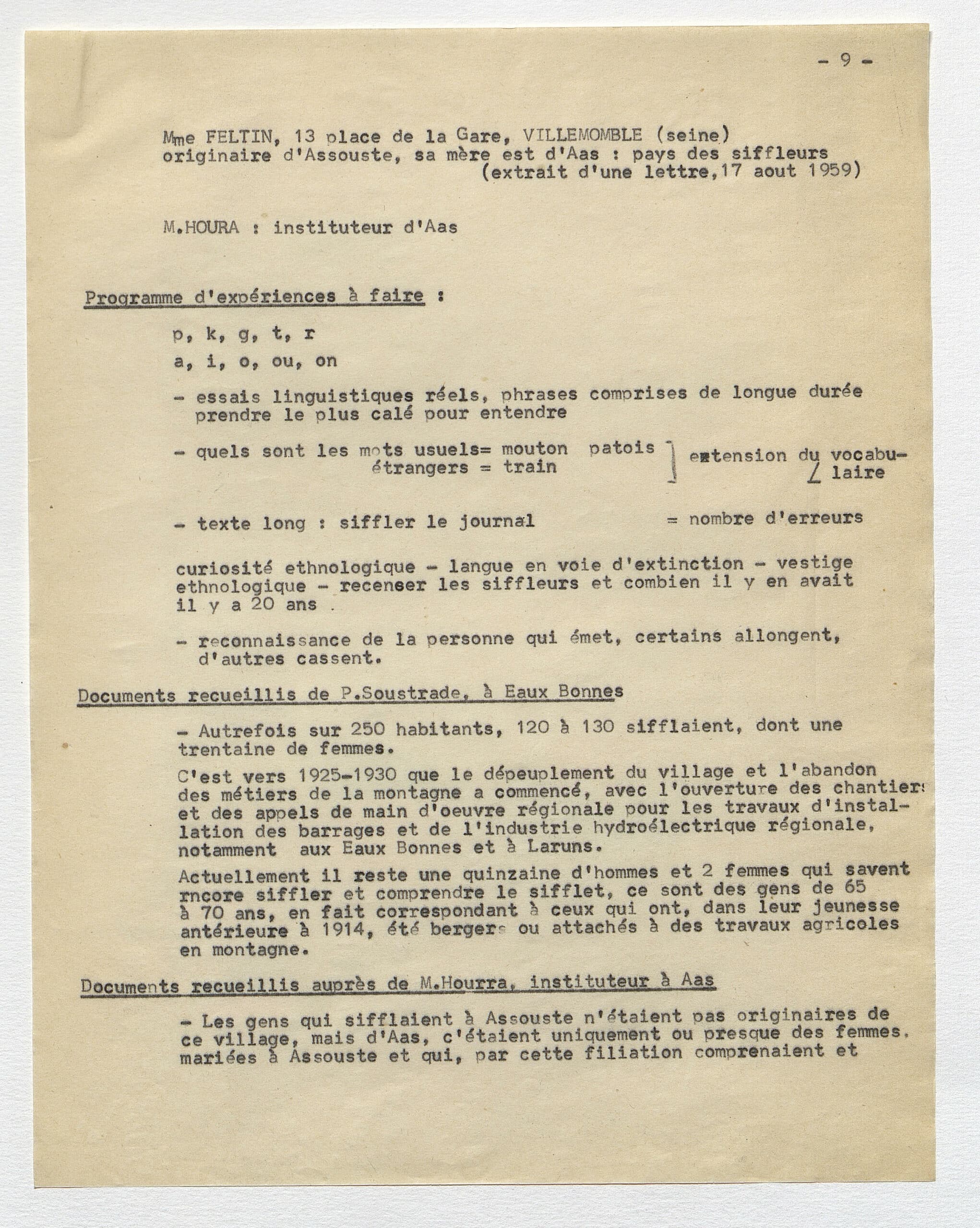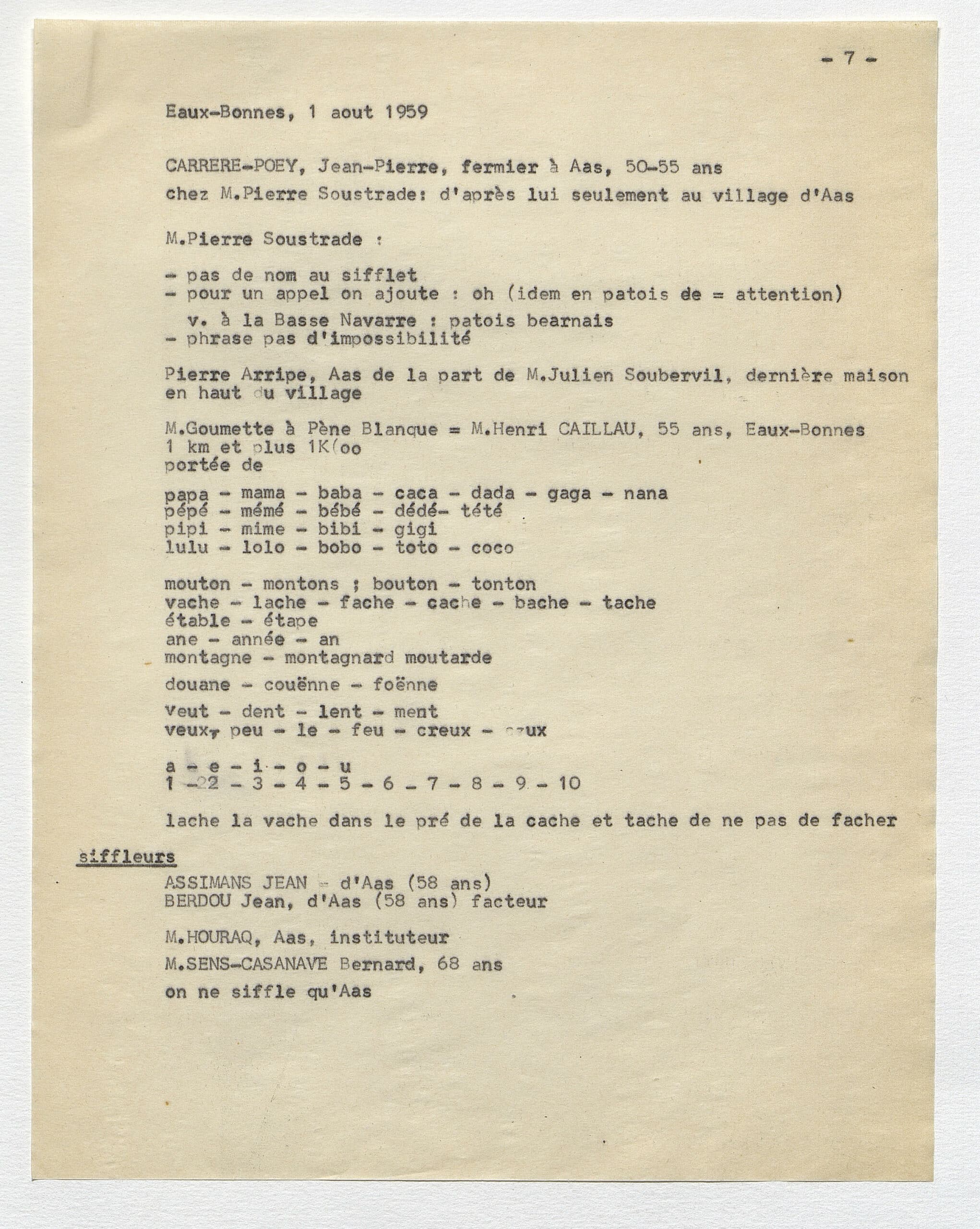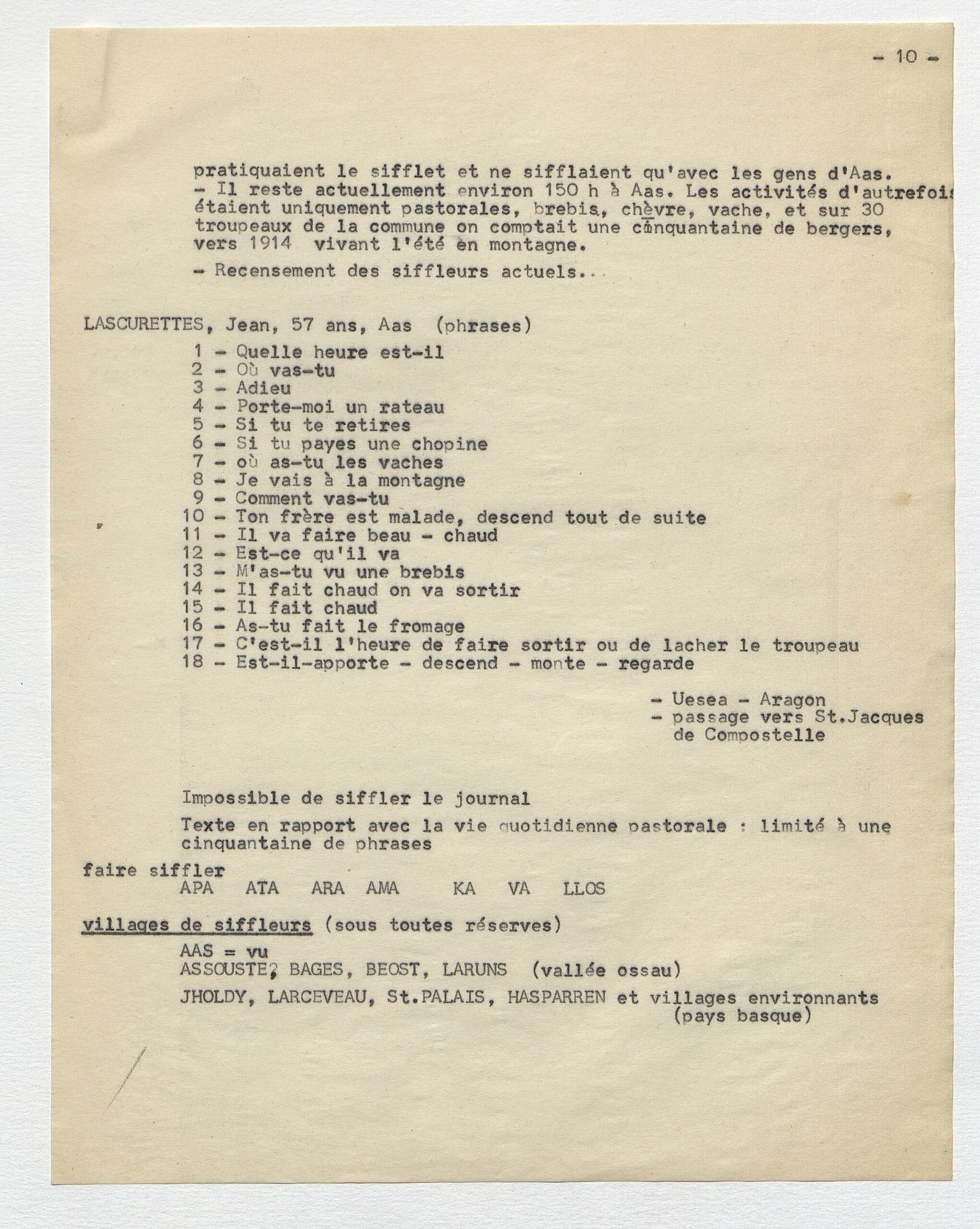 En 1959, on découvrait que les habitants du village d’Aas, en vallée d’Ossau, communiquaient à grande distance grâce à des modulations sifflées. Immédiatement, René-Guy Busnel, chercheur spécialisé en acoustique, étudia ce qu’on appellerait désormais le “langage sifflé d’Aas”. A peine 40 ans plus tard, ce mode de communication original disparut avec la mort de Netou Palas, la dernière siffleuse ossaloise.